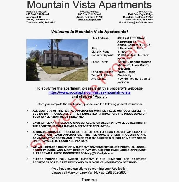 Mountain Vista Apartments 695 East Fifth Street, #13, Azusa Downstairs 1 Bedroom $1,800